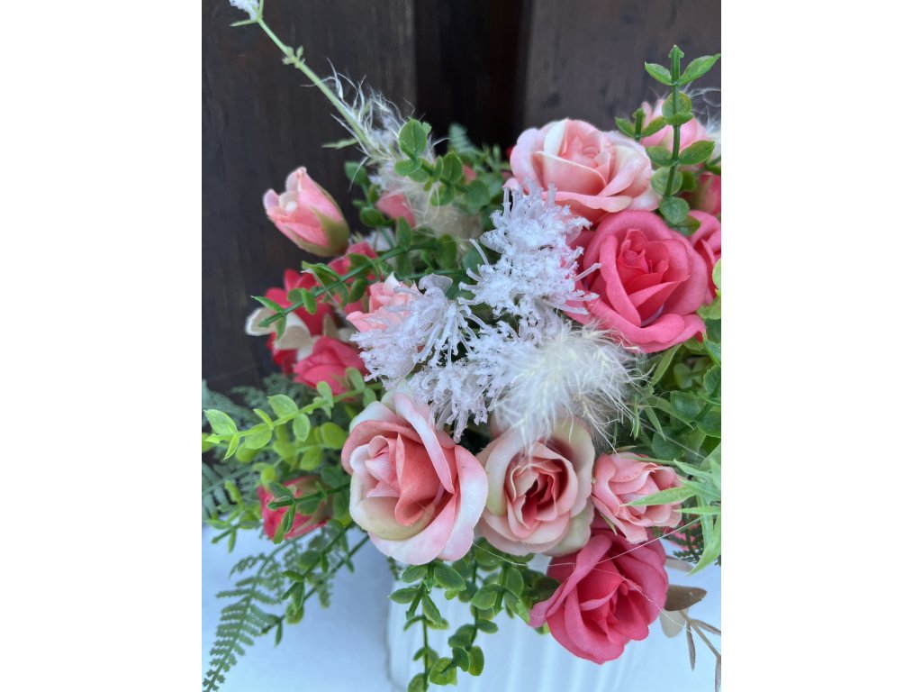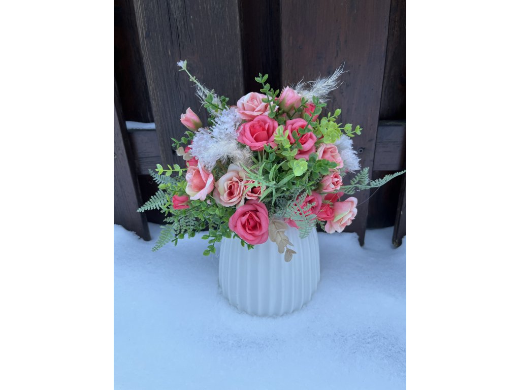 Elegantní dekorace do bytu v podobě keramické vázy s umělými květinami je nadčasovým doplňkem do moderního i klasického interiéru. Aranžmá tvoří látkové umělé růže v lososové barvě, doplněné o umělé kapradí a eukalyptus, které společně vytvářejí přirozený a vkusný vzhled bez nutnosti údržby.