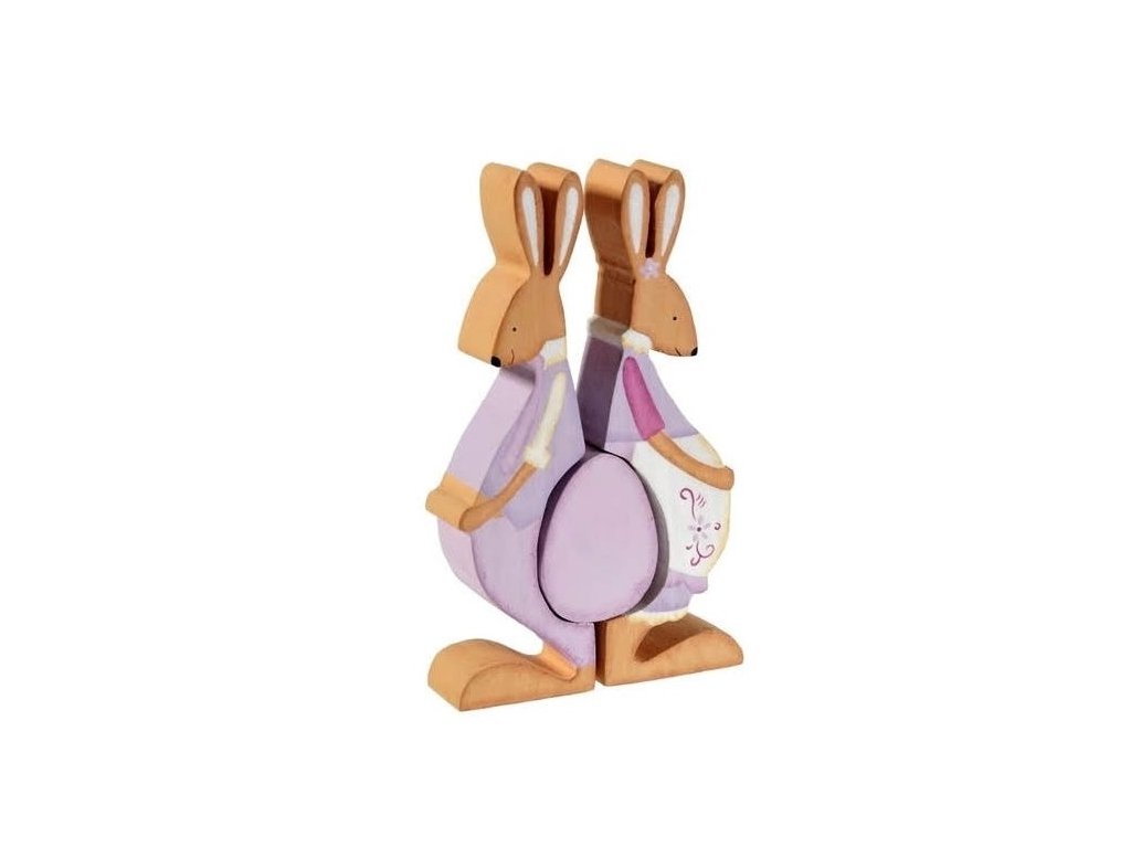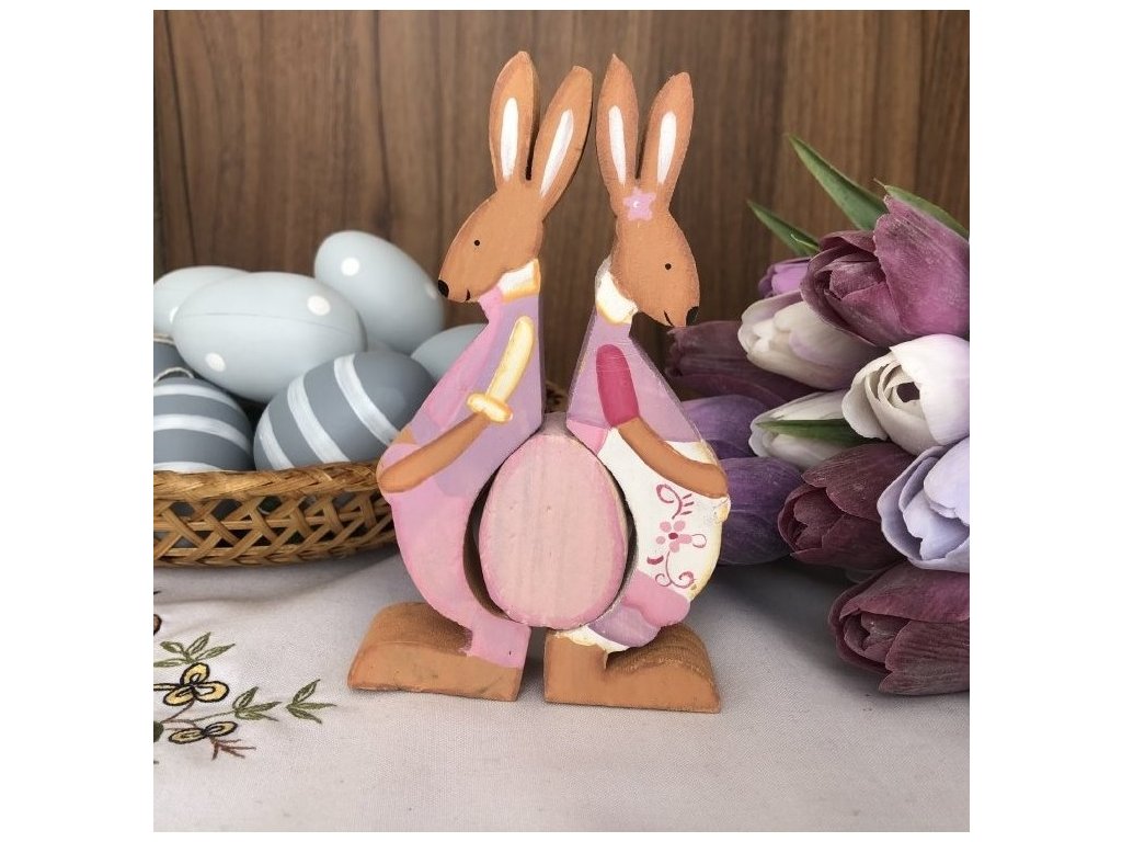 Oživte svůj domov originální velikonoční dekorací, která vnese radost, barvy a jarní energii do každého interiéru. Tato stylová dřevěná dekorace zobrazuje dva roztomilé zajíce ve fialových oblečcích, kteří se dívají na velké velikonoční vejce umístěné mezi nimi. Díky svému hravému motivu je ideální volbou pro všechny, kteří chtějí svou velikonoční výzdobu obohatit o jedinečný a moderní prvek.