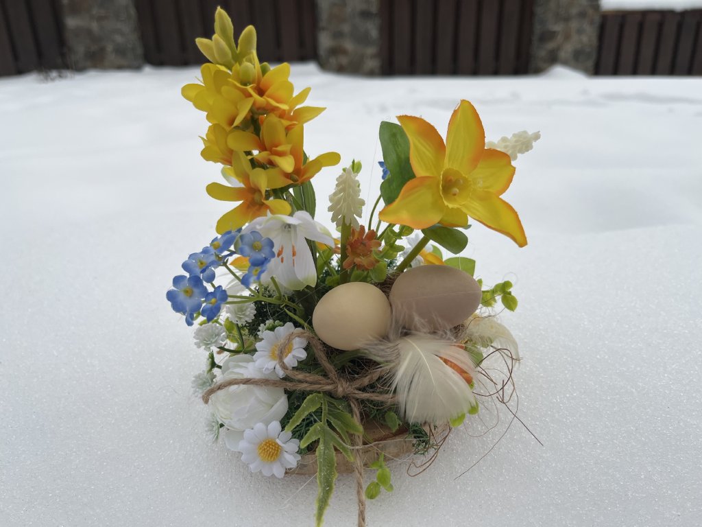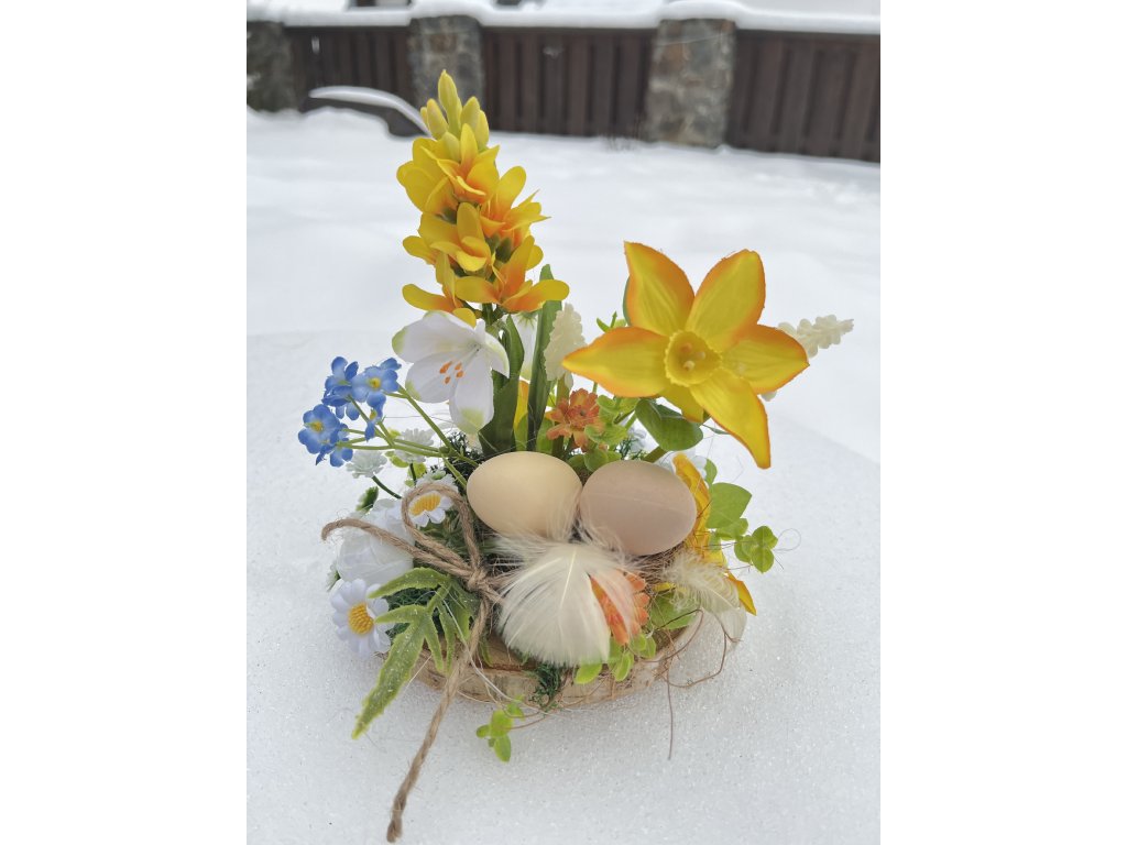 Krásná menší dekorace na konferenční stůl. Tato dekorace je na dřevěné kulatině a je ručně zdobená zelení, stabilizovaným mechem, kvalitními umělýmikavětinami jako je žlutý hyacint, žluté narcisky, bílý modřenec, pomněnky, heřmánek, pryskyřník. V pravé části dekorace jsou dvě plastová vajíčka v hnízdě, peříčka.