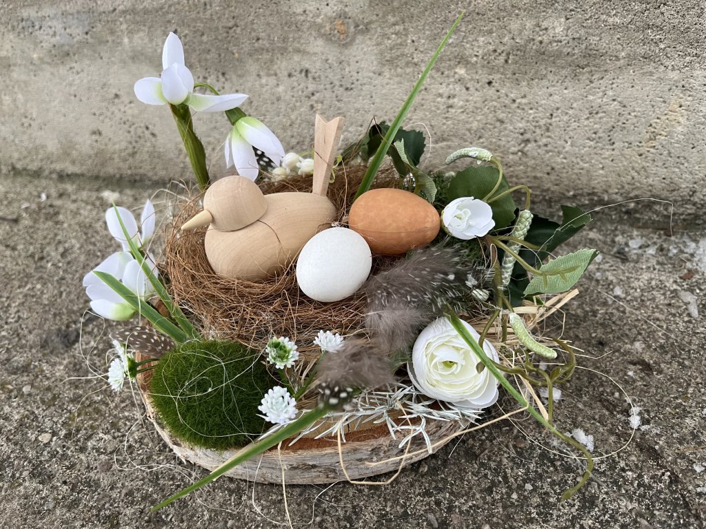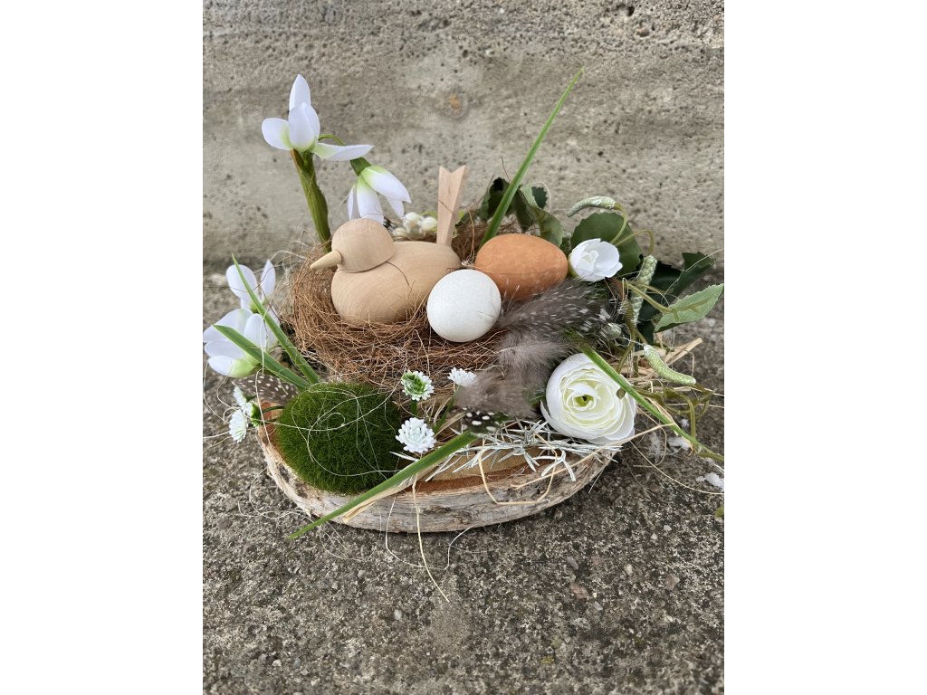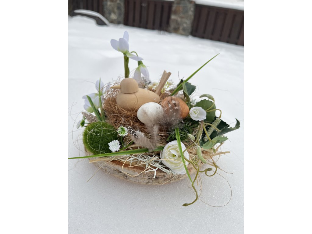 Tato ručně zdobená dekorace je dřevěné kulatině. Jarní dekoraci zdobí, sisal, stabilizovaný mech, kokosové vlákno, umělá větvička břízy, sněženky, konvalinky, bílé květy pryskyřníku, peříčka, plastová vajíčka a dřevěný ptáček.