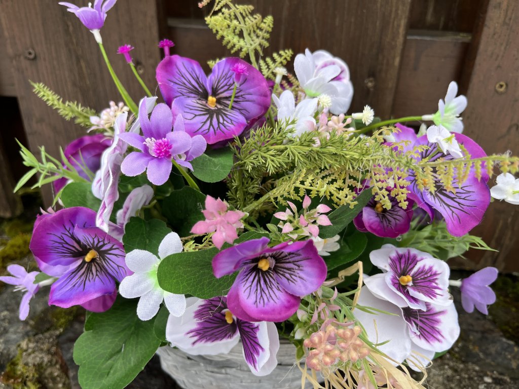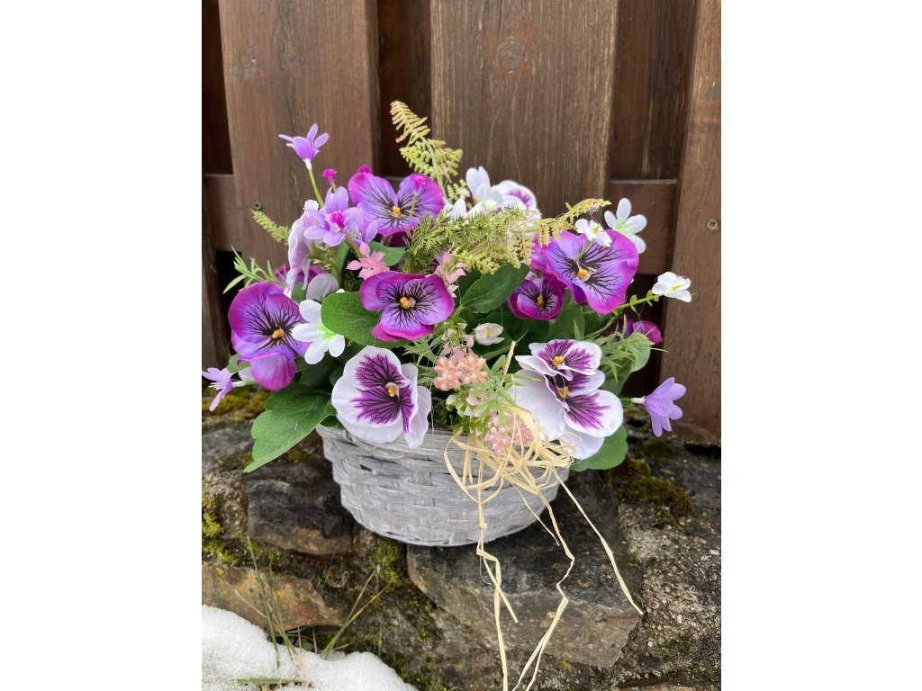 Tato jarní dekorace na hrob - zatížený šedý bambusový obal s umělými maceškami ve fialové a bílo-fialové barvě, kapradím, zelení, přírodním lýkem je ideální volbou.