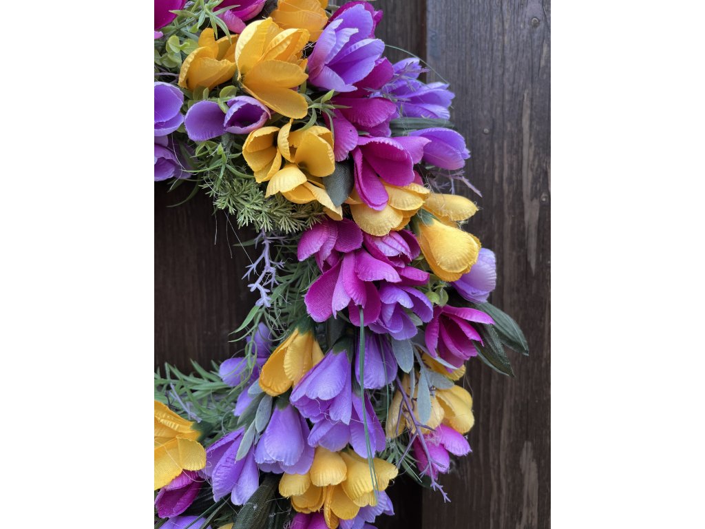 Umělý jarní věnec vydrží dlouho krásný. Krásné barvy umělých krokusů působí velmi přirozeně.