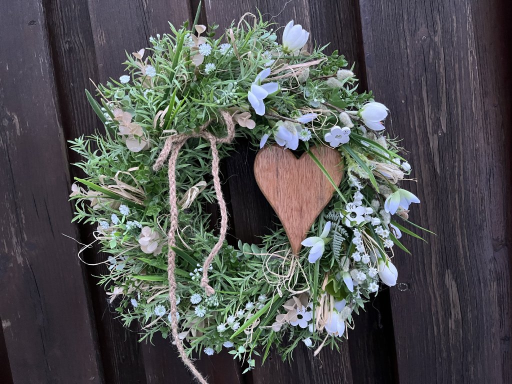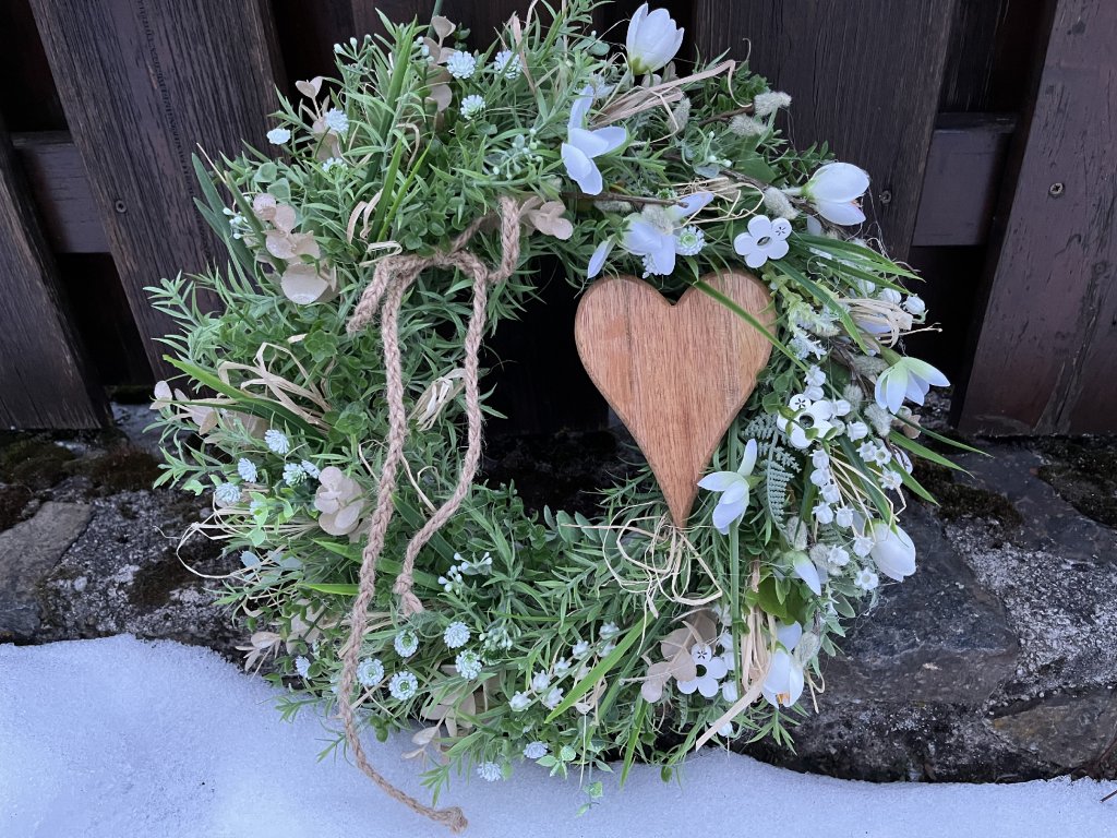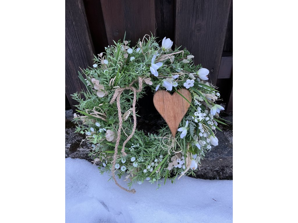 Bohatě zdobený jarní věnec je tvořen zelení, umělým eukalyptem, kapradím, umělými sněženkami, bílými krokusy, umělými kočičkami, konvalinkami a dřevěnými květy. Dominantním prvkem je dřevěné srdce, doplněné lýkem a šňůrkou, které podtrhují přírodní styl dekorace.