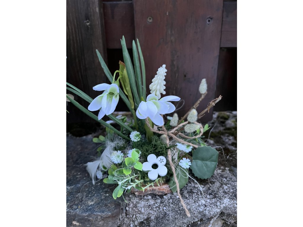 Součástí setu je také jarní dekorace na stůl na dřevěném plátu, zdobená umělými sněženkami, bílým modřencem, umělými kočičkami, sisalem, zelení, stabilizovaným mechem a dřevěnými květinami. Společně tvoří sladěnou jarní výzdobu interiéru.