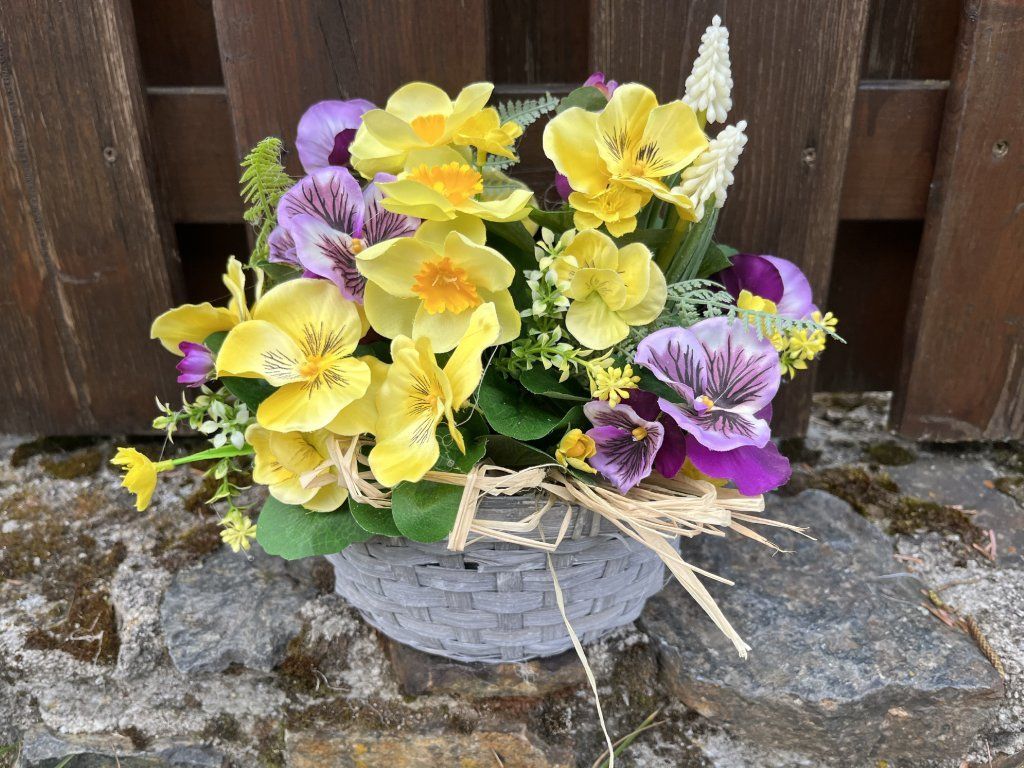 Závěrem: Šedý obal s umělými žlutými maceškami od Beskisha je vkusná, praktická a důstojná dekorace, která přináší světlo a barvu na místa posledního odpočinku.