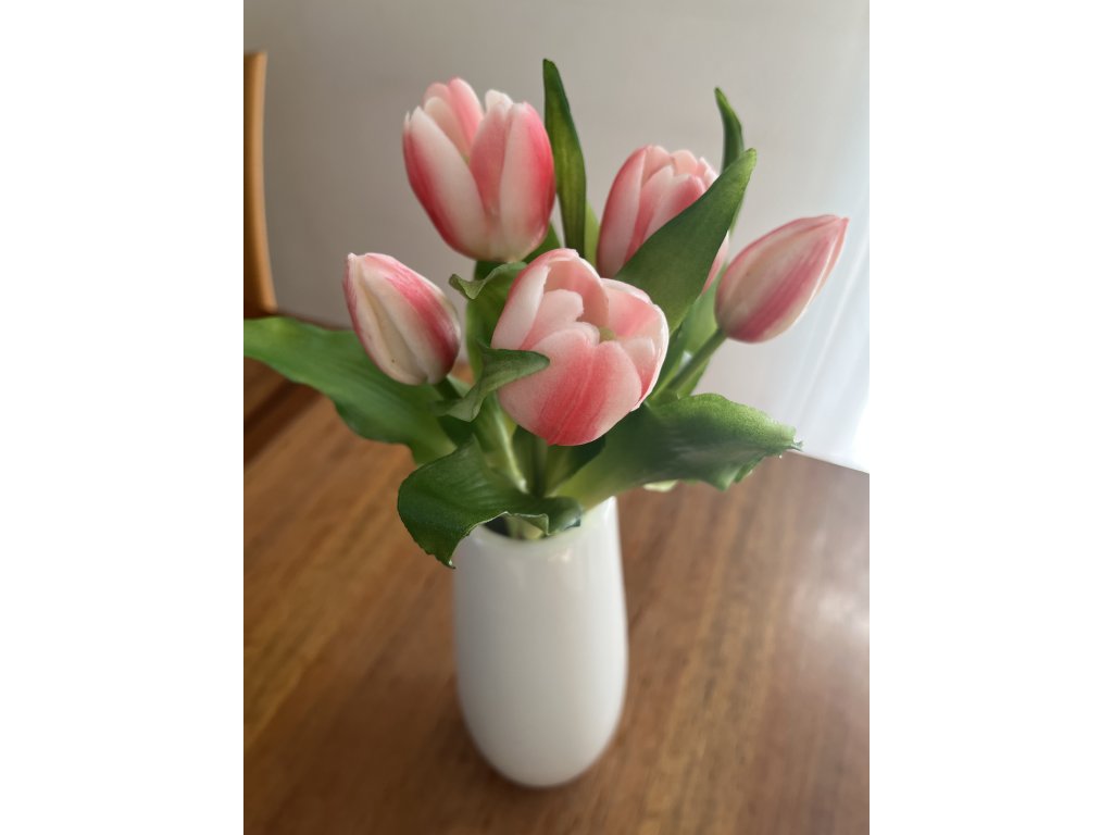 Umělé tulipány do vázy v bílorůžové barvě – kytice 27 cm jsou ideální jarní dekorací, která přinese do interiéru barvu, eleganci a dlouhotrvající krásu.