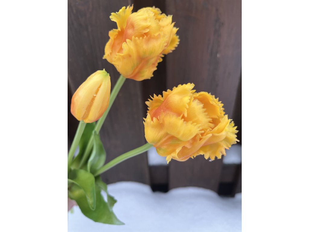 Detailně tvarované okvětní lístky tulipánů s jemným zvlněním působí přirozeně a elegantně. Zelené listy a stonky v realistických odstínech podtrhují vzhled květin jako živých. Materiál je příjemný na dotek, snadno se udržuje a je ideální pro bezúdržbovou květinovou dekoraci.