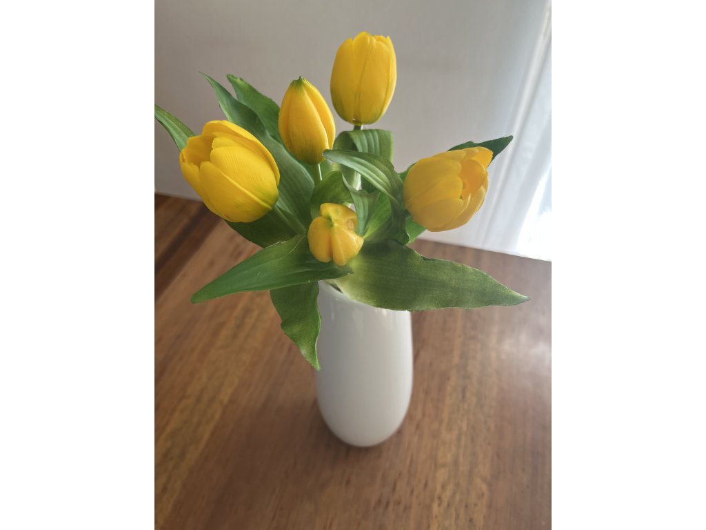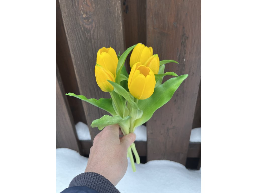 Svěží umělé tulipány silikonové ve žluté barvě jsou ideální jarní dekorací do interiéru, která vnese do prostoru barvu a přirozený vzhled bez nutnosti péče. Tato kytice umělých tulipánů obsahuje pět kusů umělých květin jako živých, vyrobených z kvalitního plastu se silikonovým vzhledem.