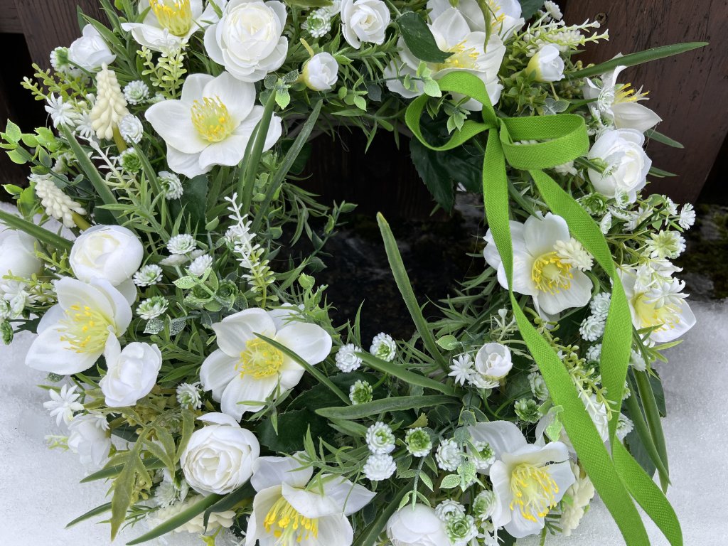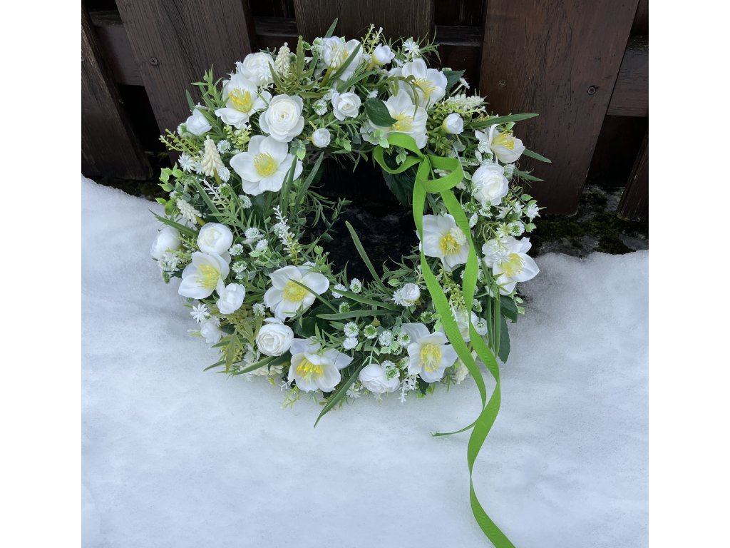 Elegantní umělý jarní věnec na dveře je jemnou a nadčasovou dekorací, která vnese do vašeho domova svěžest a přírodní harmonii. Základ tvoří ratanový věnec, který je ručně a pečlivě aranžovaný bohatou zelení, umělým eukalyptem, bílými čemeřicemi, květy pryskyřníku, drobnými bílými kvítky a bílým modřencem. Celek je doplněn zelenou stuhou, jež podtrhuje přirozený jarní charakter dekorace.