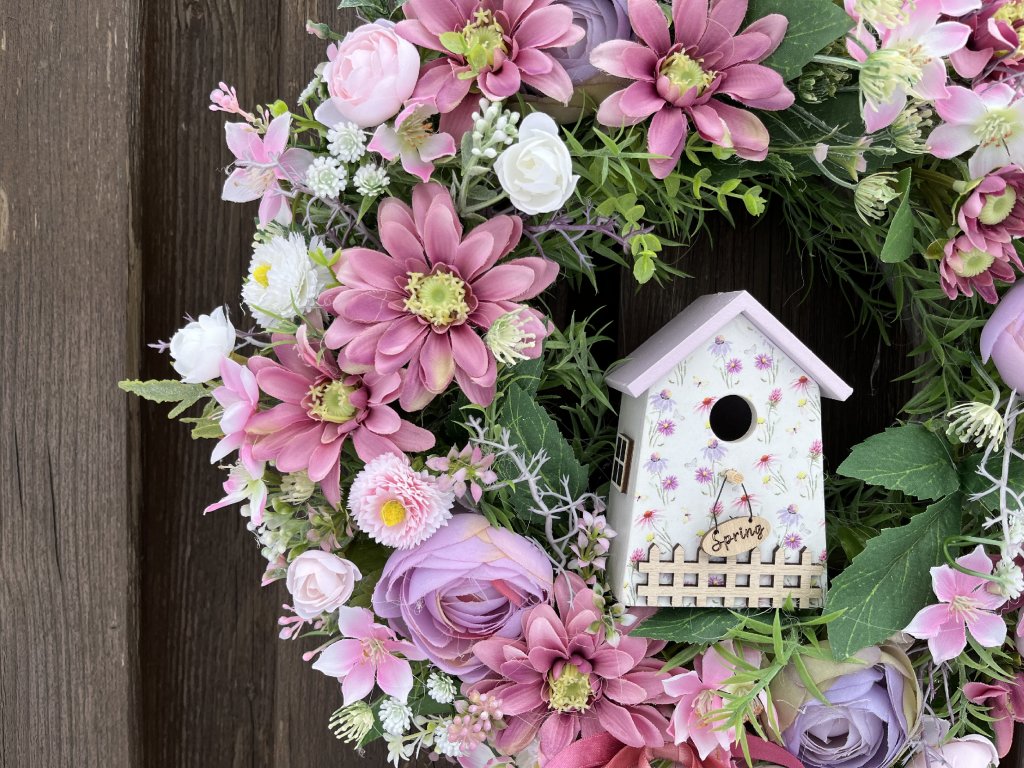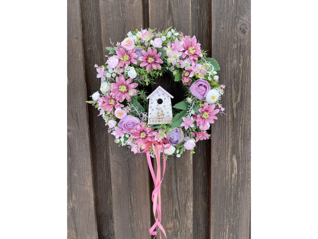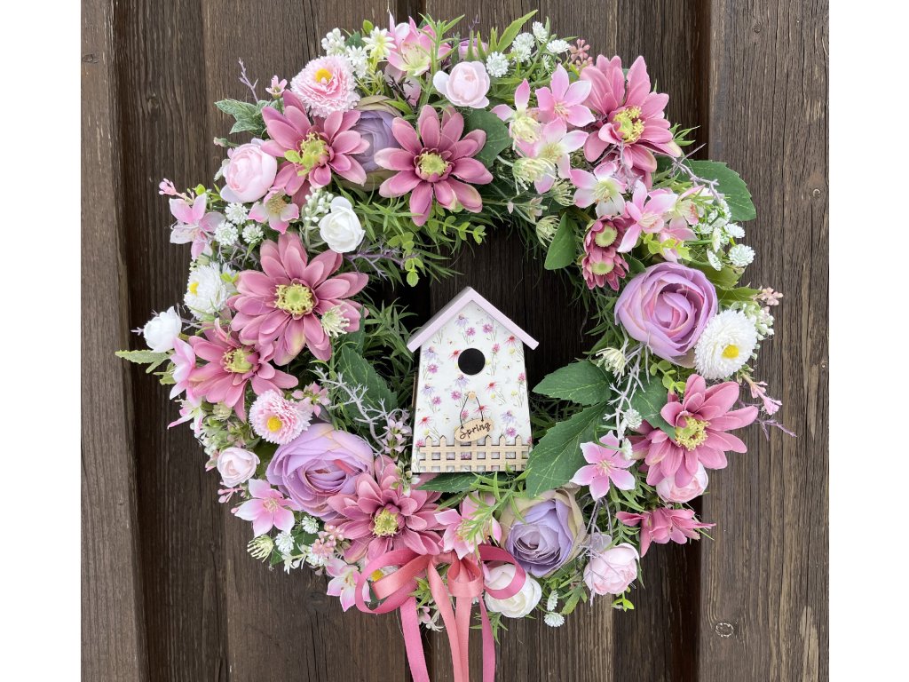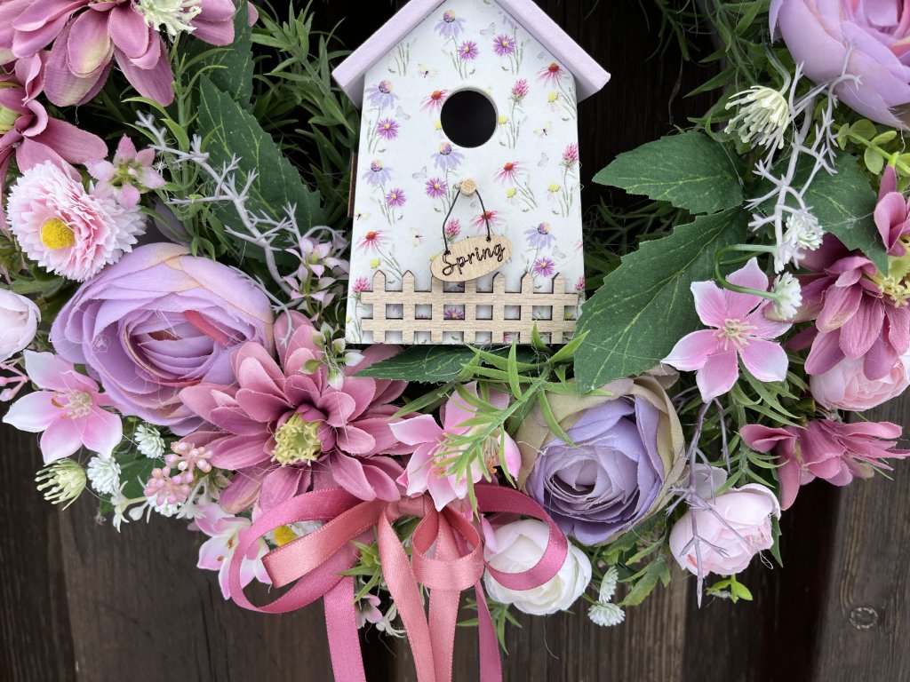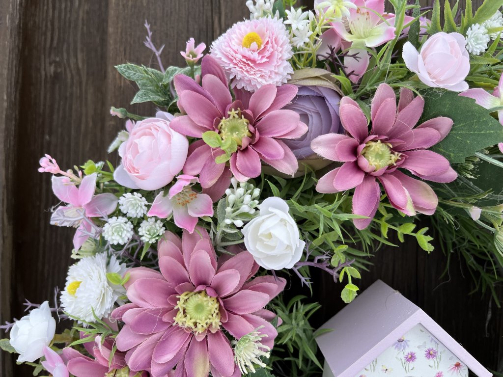 Květinové aranžmá tvoří pryskyřníky, sněženky a doplňkové umělé květy, které jsou sladěny do lila a bílé barvy. Dominantním prvkem je dekorativní budka s květinovým motivem, jež dodává věnci originální a romantický charakter. Celkový vzhled jemně doplňují ladící stuhy, které zvyšují jeho dekorativní hodnotu.